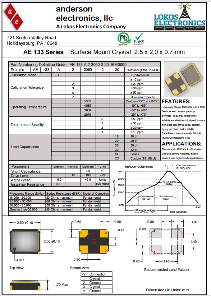 AE-133-A-3-4085-5-20-45M0000,2520mm,Anderson晶體,AE133,移動電話晶振,參數(shù)表
