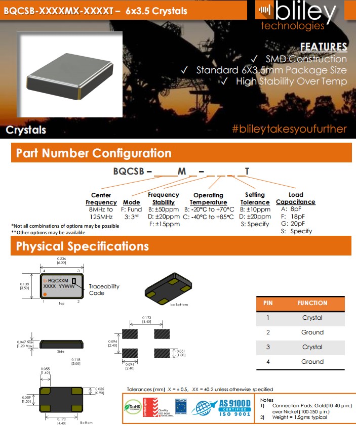 BQCSB-16MF-BCDGT,6035mm,16MHz,Bliley百利晶振,BQCSB,無源晶振,產品特點: