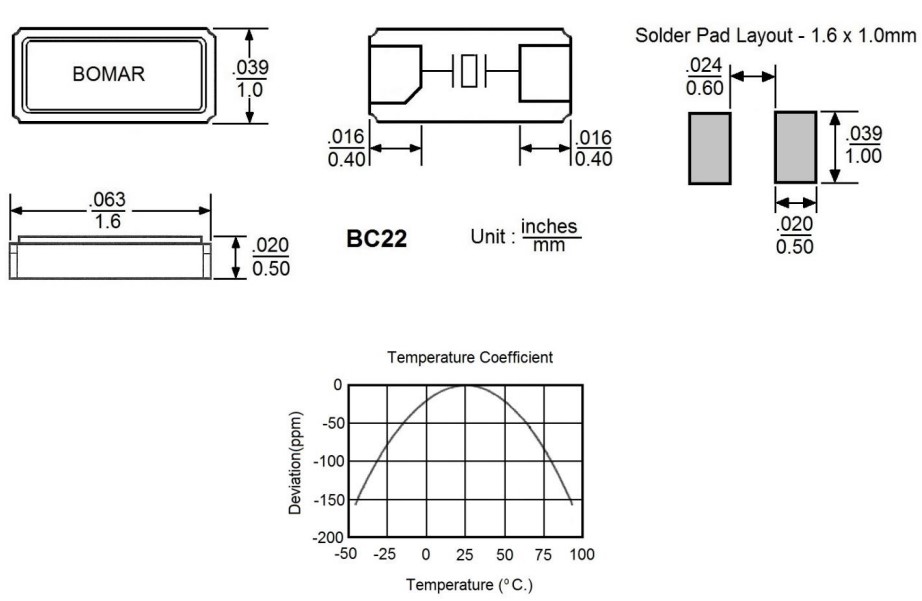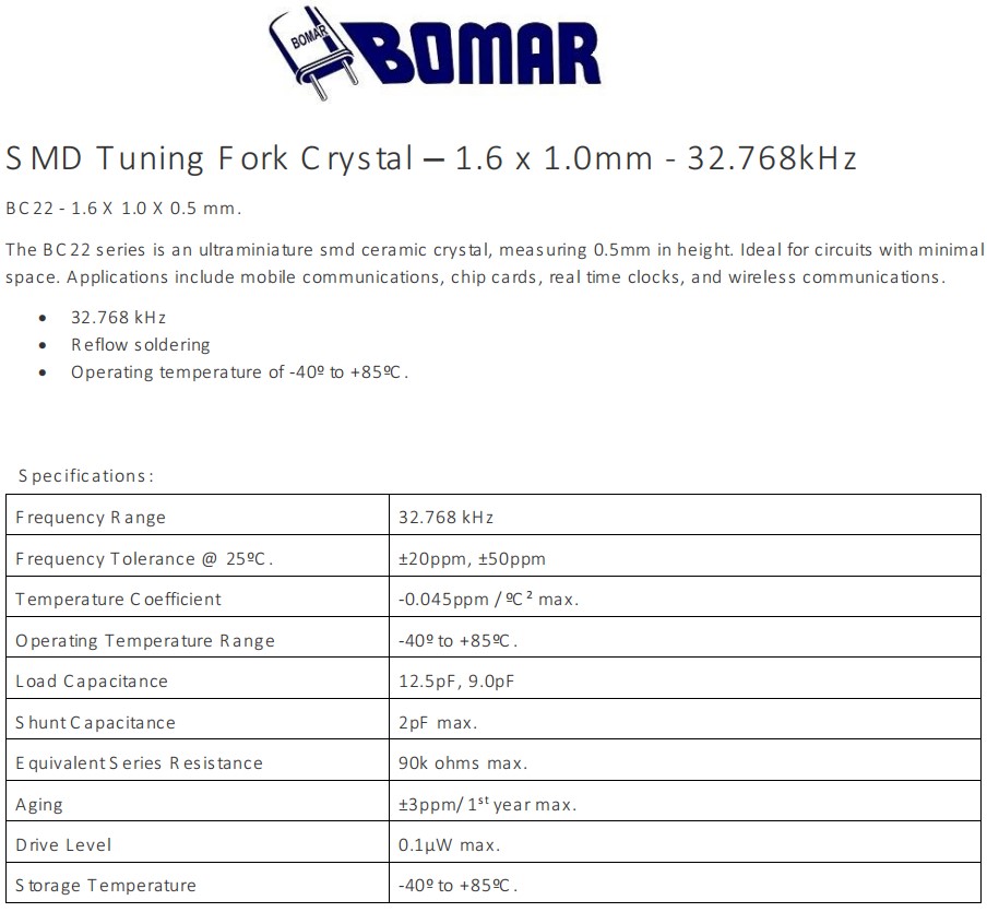 BC22CCI112.5-32.768K,1610mm,Bomar晶振,32.768KHz,BC22,實(shí)時(shí)時(shí)鐘晶振,美國進(jìn)口晶振,Bomar博馬爾晶振,型號:BC22,編碼為:BC22CCI112.5-32.768K,負(fù)載:12.5pF,精度:±20ppm,頻率為:32.768KHz,工作溫度范圍:-40℃至+85℃。小體積晶振尺寸:1.6x1.0x0.5mm,兩腳貼片晶振,無源晶振,石英晶振,石英晶體諧振器,無鉛環(huán)保晶振,1610mm晶振,超小型晶振,輕薄型晶振。BC22系列是一種超薄的SMD石英晶振,高度為0.5毫米。非常適用于空間最小的電路。應(yīng)用程序:移動(dòng)通信、芯片卡、實(shí)時(shí)時(shí)鐘,無線通信,智能手機(jī),儀器儀表設(shè)備,鐘表電子,時(shí)鐘晶振,平板電腦,數(shù)碼電子等應(yīng)用。