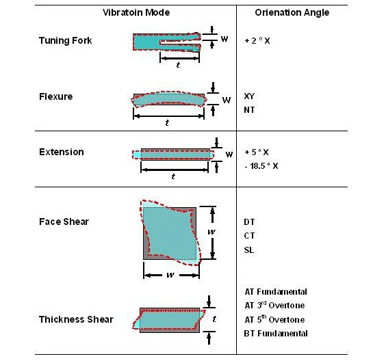 經(jīng)由不同的石英切割角度及不同電極型狀的電場效應(yīng), 石英芯片展現(xiàn)了各種不同的振動模態(tài). 以經(jīng)常產(chǎn)生的振動模態(tài)可以概分為擾曲模態(tài)(flexure mode), 伸縮模態(tài)(extension mode), 面剪切模態(tài)(face shear mode) 和 厚度剪切模態(tài)(thickness shear mode). 這幾種振動模態(tài)以簡單的方法在表一中可以看到. 在實際狀況中, 石英芯片并不是一定祇有單一種振動模態(tài), 而可能有多種模態(tài)同時存在在一個石英芯片的振蕩中, 經(jīng)由適當?shù)脑O(shè)計, 可以壓制其它不希望產(chǎn)生的振動模態(tài)(unwanted mode), 來達到主要振動模態(tài)的最佳化.