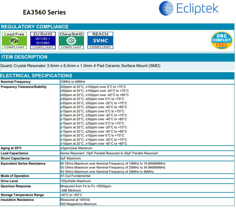 ECLIPTEK晶振,EA3560石英晶體諧振器,EA3560NA20-20.000M-TR晶振, Ecliptek日蝕晶振公司成立于1987年,是一家SMD石英晶體,貼片晶振頻率元件控制市場上公認的領導者.日蝕晶振公司擁有先進的產品和領先的技術使我們能夠為客戶提供最好的石英晶體,貼片晶振,石英水晶和有源晶振,石英晶體振蕩器,貼片振蕩器產品.