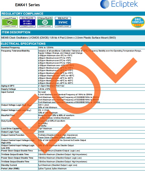 EMK41時鐘有源振蕩器,日蝕晶振,EMK41H2H-20.000M-TR晶振,有源晶振,是指晶體本身起振需要外部電壓供應,起振后可直接驅動CMOS集成電路,產品本身已實現與薄型IC(TSSOP封裝,TVSOP封裝)同樣的1mm厚度,斷開時的消費電流是15µA以下,編帶包裝方式可對應自動搭載及IR回流焊接(無鉛對應)產品有幾種電壓供選1.8V,2.5V,3V3.3V,5V,以應對不同IC產品需要.