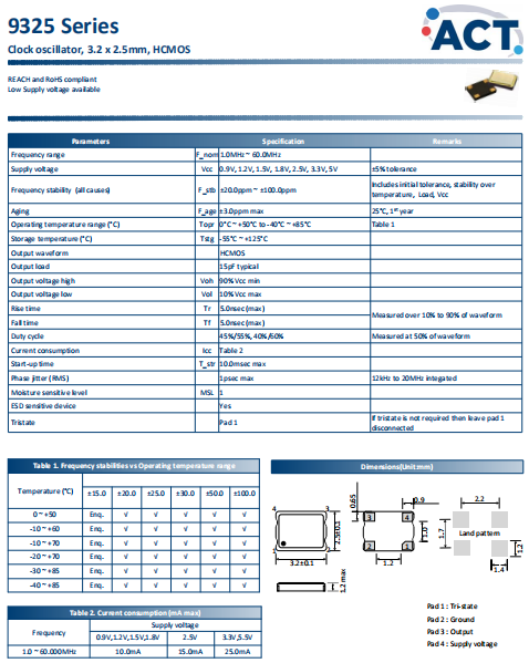 ACT晶振,9325晶振,SPXO振蕩器.3225mm體積非常小的SMDcrystal器件,是民用小型無線數(shù)碼產(chǎn)品的最佳選擇,小體積的晶振被廣泛應(yīng)用到,手機藍牙,GPS定位系統(tǒng),無線通訊集,高精度和高頻率的穩(wěn)定性能,非常好的減少電磁干擾的影響,是民用無線數(shù)碼產(chǎn)品最好的選擇,符合RoHS/無鉛.