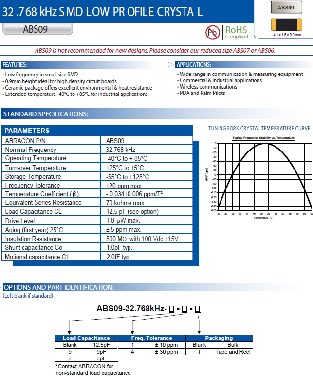Abracon晶振, ABS09-32.768KHZ-9-T石英晶體,ABS09晶體諧振器.32.768K時鐘晶體具有小型,薄型,輕型的貼片晶振表面音叉型晶體諧振器,產(chǎn)品具有優(yōu)良的耐熱性,耐環(huán)境特性,可發(fā)揮晶振優(yōu)良的電氣特性,符合RoHS規(guī)定,滿足無鉛焊盤的高溫回流溫度曲線要求,金屬外殼的封裝使得產(chǎn)品在封裝時能發(fā)揮比陶瓷諧振器外殼更好的耐沖擊性.