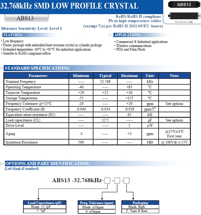 Abracon晶振,ABS13-32.768KHZ-T進口晶振,ABS13石英諧振器.貼片晶振本身體積小,薄型石英晶體諧振器,特別適用于有目前高速發展的高端電子數碼產品,因為晶振本身小型化需求的市場領域,小型,薄型是對應陶瓷諧振器(偏差大)和普通的石英晶體諧振器(偏差小)的中間領域的一種性價比較出色的產品.產品廣泛用于筆記本電腦,無線電話,衛星導航HDD,SSD,USB,Blu-ray等用途,符合無鉛焊接的高溫回流焊曲線特性.