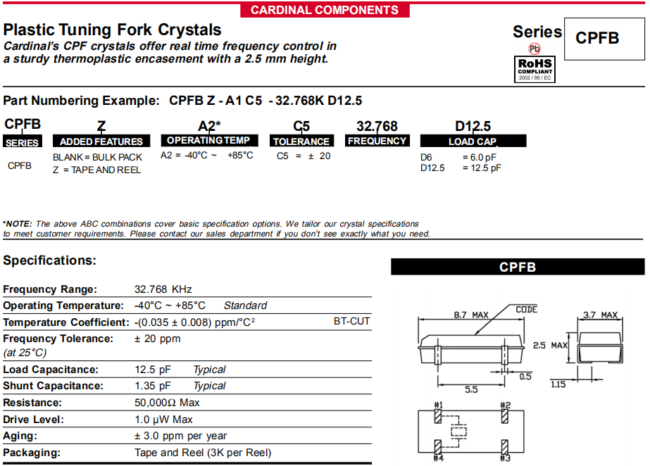 Cardinal晶振,CPFB晶振,時鐘晶體諧振器.32.768K系列具有超小型,薄型,質地輕的表面貼片音叉型石英晶體諧振器,晶振產品本身具備優良的耐熱性,耐環境特性,在辦公自動化,家電領域,移動通信領域可發揮優良的電氣特性,符合無鉛標準,滿足無鉛焊接的回流溫度曲線要求,金屬外殼的石英晶振使得產品在封裝時能發揮比陶瓷晶振外殼更好的耐沖擊性能.