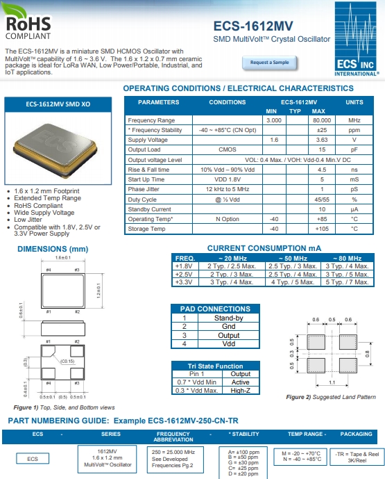 ECS晶體,ECS振蕩器,ECS-1612MV耐高溫晶振.晶振本身小型,薄型,重量輕,晶體具有優良的耐環境特性,如耐熱性,耐沖擊性,在辦公自動化,家電相關電器領域及Bluetooth,Wireless LAN等短距離無線通信領域可發揮優良的電氣特性,滿足無鉛焊接的回流溫度曲線要求.