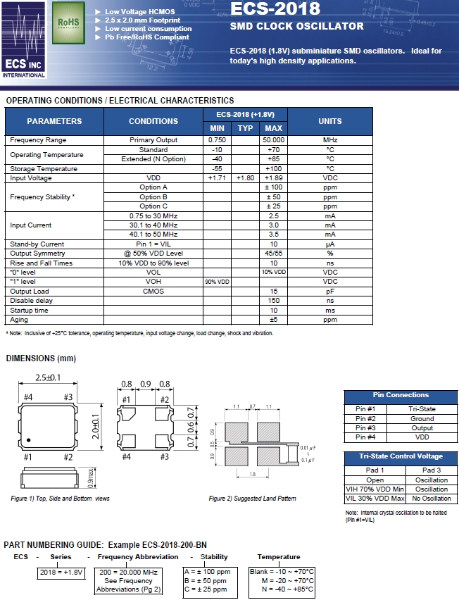 ECS晶振,ECS-2018-130-BN壓電晶振,ECS-2018振蕩器.貼片石英晶體,體積小,焊接可采用自動貼片系統,產品本身小型,表面貼片晶振,特別適用于有小型化要求的電子數碼產品市場領域,因產品小型,薄型優勢,耐環境特性,包括耐高溫,耐沖擊性等,在移動通信領域得到了廣泛的應用,晶振產品本身可發揮優良的電氣特性,滿足無鉛焊接的高溫回流溫度曲線要求.