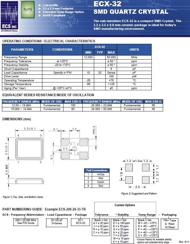ECS晶振,ECS-320-20-33-CKM-TR無源晶振,ECX-32水晶振子.小型表面貼片型貼片晶振,較適合使用在數碼電子產品領域中,也是特別要求高可靠性的引擎控制用CPU的時鐘部分.低頻晶振可從12MHz起對應,小型,薄型具備強防焊裂性,石英晶體在惡劣嚴酷的環境條件下也能發揮穩定的起振特性,產品本身具有耐熱,耐振,耐撞擊等優良的耐環境特性,滿足無鉛焊盤以及高溫回流溫度曲線要求,符合AEC-Q200認證.
