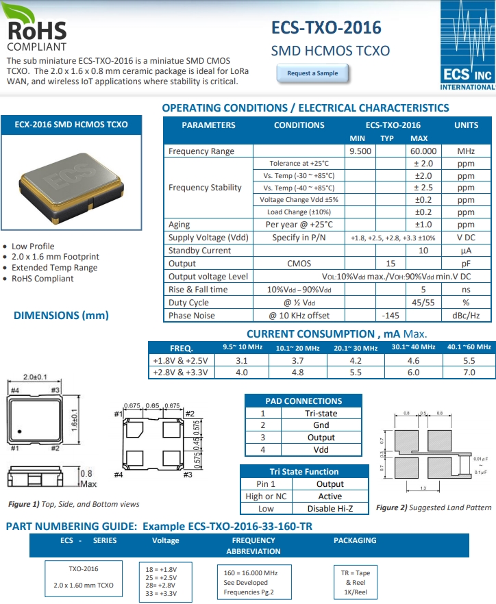 ECS晶振,有源晶振,ECS-TXO-2016溫補晶振.小型,輕型,低消耗電流,表面貼片型產品.(可對應回流焊)無鉛產品.滿足無鉛焊盤的高溫回流溫度曲線要求,帶有AFC(頻率控制)功能,Enable/Disable功能,產品本身可根據使用需要進行選擇.