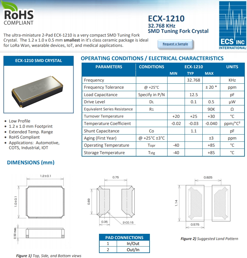 ECS晶體,伊西斯晶振,ECX-1210表晶.小型,薄型,質地輕的表面貼片音叉型晶體諧振器,手機晶體,產品體積小,特別適用于各種小巧的便攜式消費電子數碼產品,在移動通信領域廣泛的應用,晶振產品本身可發揮優良的電氣特性,滿足無鉛焊盤的高溫回流溫度曲線要求.