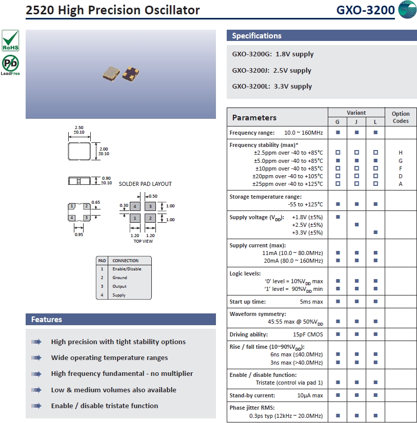 Golledge晶體,高利奇晶振,GXO-3200水晶振蕩子.小型貼片有源晶振,體積的變小也使產品帶來了更高的穩(wěn)定性能,接縫密封石英晶體振蕩器,精度高,覆蓋頻率范圍寬的特點,貼片高速自動安裝和高溫回流焊設計,Optionable待機輸出三態(tài)輸出功能,電源電壓范圍:1.8V?5V,高穩(wěn)定性,低抖動,低功耗,主要應用領域:無線通訊,智能手機,平板筆記本WLAN,藍牙,數碼相機,DSL和各式IT產品的晶振應用,三態(tài)功能,PC和LCDM等數碼領域,符合RoHS/無鉛.
