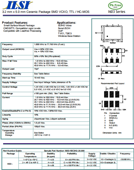 ILSI晶振,I603晶振,壓控晶體振蕩器.有源晶振,是只晶體本身起振需要外部電壓供應,起振后可直接驅動CMOS 集成電路,產品本身已實現與薄型IC(TSSOP封裝,TVSOP封裝)同樣的1mm厚度,斷開時的消費電流是15 µA以下,編帶包裝方式可對應自動搭載及IR回流焊接(無鉛對應)產品有幾種電壓供選1.8V,2.5V,3V3.3V,5V,以應對不同IC產品需要.