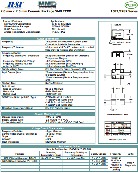 ILSI晶振,I787晶振,VC-TCXO振蕩器.具有最適合于移動(dòng)通信設(shè)備用途的高穩(wěn)定的頻率溫度特性.為對(duì)應(yīng)低電源電壓的產(chǎn)品.(可對(duì)應(yīng)DC +1.8 V±0.1 V to +3.2 V±0.1 V )高度:最高1.0 mm,體積:0.007 cm3,重量:0.024g,超小型,輕型.低消耗電流,表面貼片型產(chǎn)品.(可對(duì)應(yīng)回流焊) 無鉛產(chǎn)品.滿足無鉛焊接的回流溫度曲線要求.
