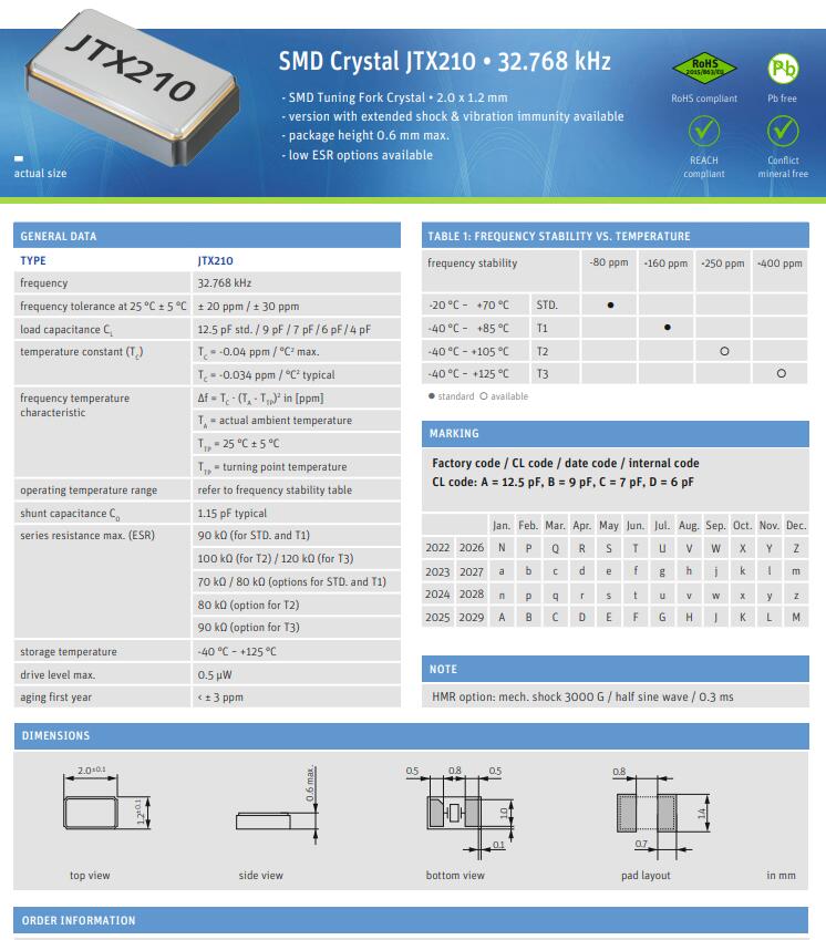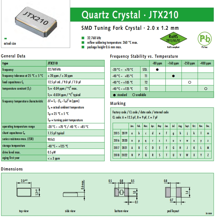 JAUCH晶振,JTX210晶振,音叉晶振.小型貼片石英晶振,外觀尺寸具有薄型表面貼片型石英晶體諧振器,特別適用于有小型化要求的市場領域,比如智能手機,無線藍牙,平板電腦等電子數碼產品.晶振本身超小型,薄型,重量輕,晶體具有優良的耐環境特性,如耐熱性,耐沖擊性,在辦公自動化,家電相關電器領域及Bluetooth,WirelessLAN等短距離無線通信領域可發揮優良的電氣特性,滿足無鉛焊接的回流溫度曲線要求.