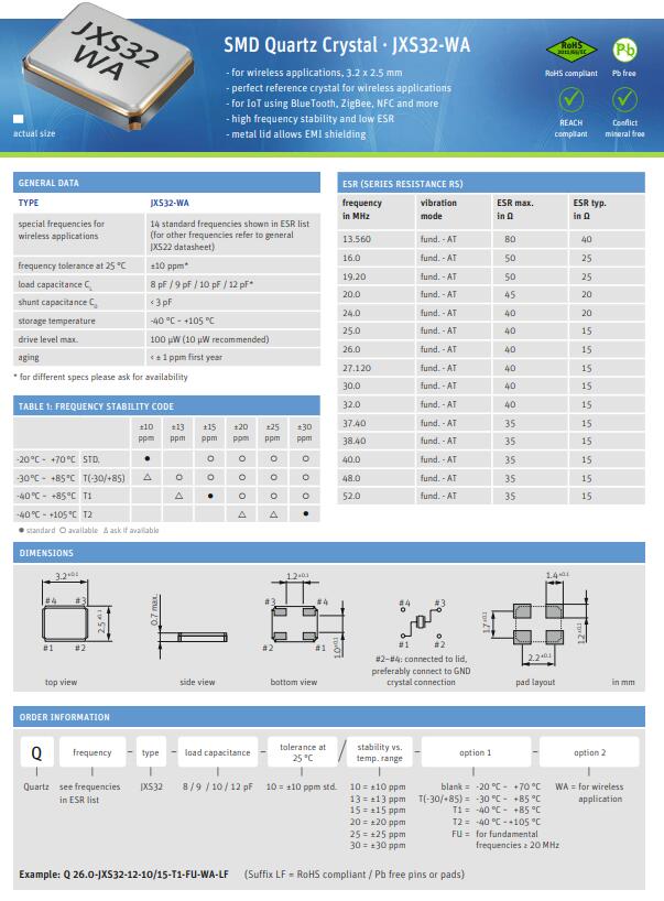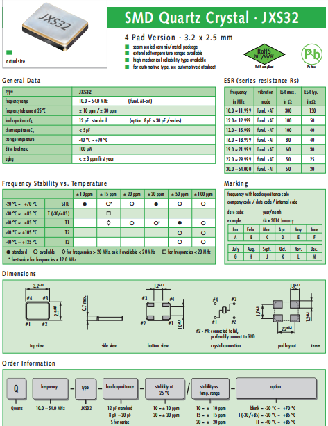 JAUCH晶振,JXS32晶振,四腳貼片晶振.貼片石英晶振最適合用于車載電子領域的小型表面貼片石英晶體諧振器.也可對應有高可靠性要求的引擎控制用CPU的時鐘部分簡稱為時鐘晶體振蕩器,在極端嚴酷的環境條件下也能發揮穩定的起振特性,產品本身具有耐熱,耐振,耐撞擊等優良的耐環境特性,滿足無鉛焊接的回流溫度曲線要求,符合AEC-Q200標準.