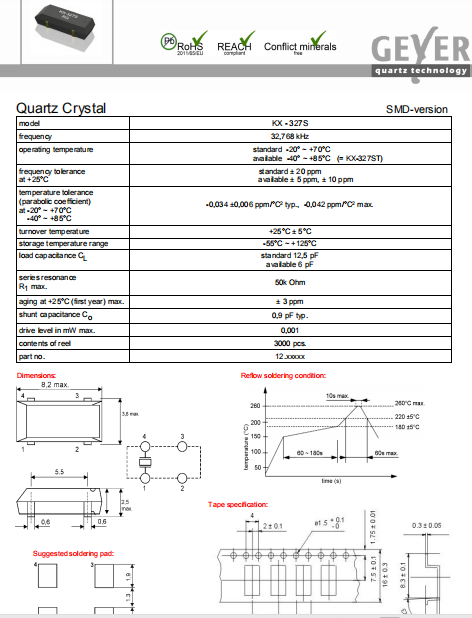 Geyer晶振,KX-327S晶振,無鉛晶振.超小型,薄型,質(zhì)地輕的表面貼片音叉型石英晶體諧振器,手機(jī)晶體,產(chǎn)品體積小,特別適用于各種小巧的便攜式消費(fèi)電子數(shù)碼產(chǎn)品,在移動(dòng)通信領(lǐng)域得到了廣泛的應(yīng)用,晶振產(chǎn)品本身可發(fā)揮優(yōu)良的電氣特性,滿足無鉛焊接的高溫回流溫度曲線要求.