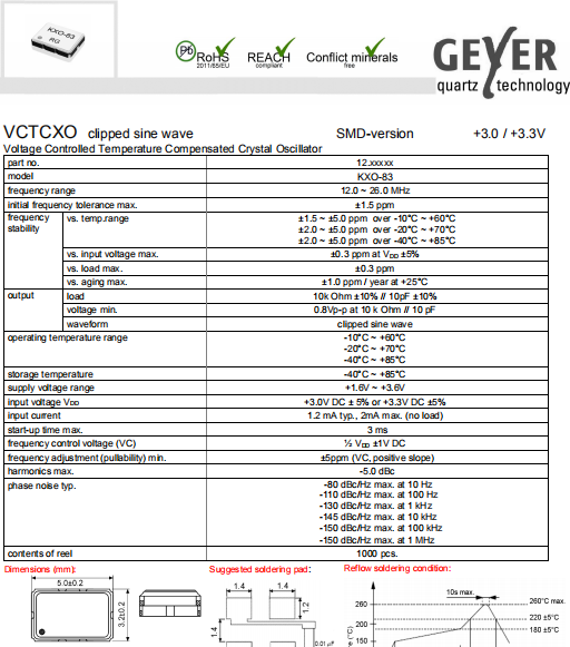 Geyer晶振,KXO-83晶振,壓控溫補晶振.小型SMD有源晶振,從最初超大體積到現(xiàn)在的7050mm,6035mm,5032mm,3225mm,2520mm體積,有著翻天覆地的改變,體積的變小也使產品帶來了更高的穩(wěn)定性能,接縫密封石英晶體振蕩器,精度高,覆蓋頻率范圍寬的特點,SMD高速自動安裝和高溫回流焊設計,Optionable待機輸出三態(tài)輸出功能,電源電壓范圍:1.8V?5 V,高穩(wěn)定性,低抖動,低功耗,主要應用領域:無線通訊,高端智能手機,平板筆記本WLAN,藍牙,數(shù)碼相機,DSL和其他IT產品的晶振應用,三態(tài)功能,PC和LCDM等高端數(shù)碼領域,符合RoHS/無鉛.