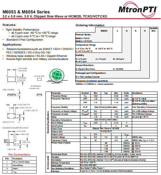 MTRONPTI晶振,M6053晶振,溫補晶體振蕩器.5032mm體積的石英晶體振蕩器,有源晶振,該產品可驅動2.5V的溫補晶振,壓控晶振,VC-TCXO晶體振蕩器產品,電源電壓的低電耗型,編帶包裝方式,可對應自動高速貼片機自動焊接,及IR回流焊接(無鉛對應),為無鉛產品,超小型,質地輕.產品被廣泛應用到集成電路,程控交換系統,無線發射基站.