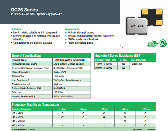 qantek晶振,QC25晶振,高性能SMD晶振.超小型表面貼片型SMD晶振,最適合使用在通訊電子領(lǐng)域中,也是特別要求高可靠性的引擎控制用CPU的時鐘部分.低頻晶振可從16MHz起對應(yīng),小型,超薄型具備強防焊裂性,石英晶體在極端嚴(yán)酷的環(huán)境條件下也能發(fā)揮穩(wěn)定的起振特性,產(chǎn)品本身具有耐熱,耐振,耐撞擊等優(yōu)良的耐環(huán)境特性,滿足無鉛焊接以及高溫回流溫度曲線要求.