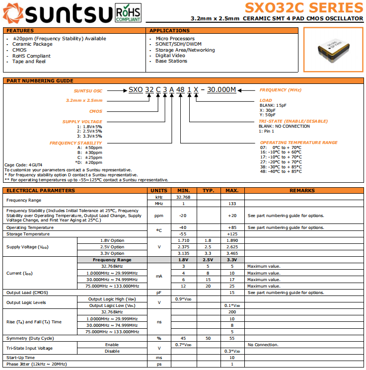 suntsu晶振,SXO32C晶振,石英晶體振蕩器.有源晶振,是只晶體本身起振需要外部電壓供應(yīng),起振后可直接驅(qū)動CMOS 集成電路,產(chǎn)品本身已實現(xiàn)與薄型IC(TSSOP封裝,TVSOP封裝)同樣的1mm厚度,斷開時的消費(fèi)電流是15 µA以下,編帶包裝方式可對應(yīng)自動搭載及IR回流焊接(無鉛對應(yīng))產(chǎn)品有幾種電壓供選1.8V,2.5V,3V3.3V,5V,以應(yīng)對不同IC產(chǎn)品需要.