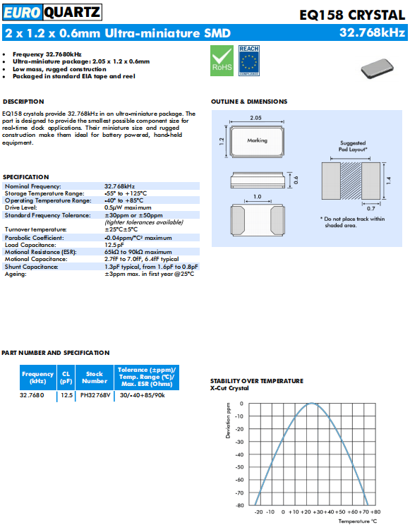EUROQUARTZ小體積晶振EQ158,32.7680 12.5 PH32768V 20/-40+85/90k,6G無線晶振,32.768KHz晶振,智能手機晶振,參數表