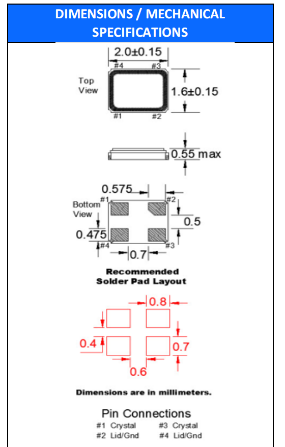 2016mm,FC1BSHHVK50.0-1-T3,50MHz,FC1BS,FOX四腳貼片晶振,無源晶振,無線應用晶振,尺寸圖