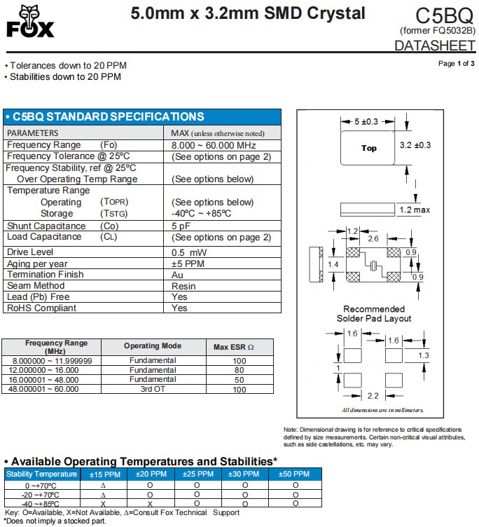 | FQ5032B-10.000 | Fox晶振 | C5BQ | 10MHz | 無源晶振 | ±30ppm |