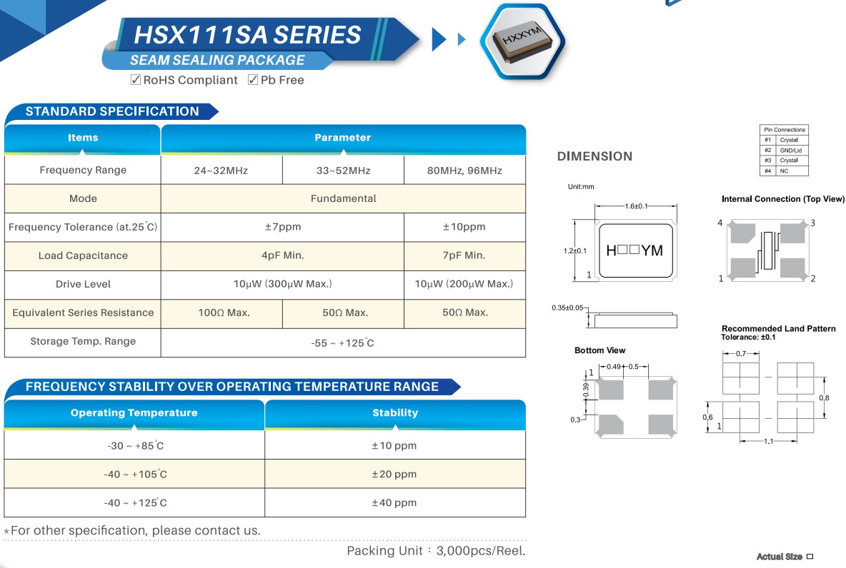H.ELE加高無源晶振,X1CO37400BG1H-HZ,HSX111SA超小型晶振,1612貼片晶振,6G無線模塊晶振,參數表