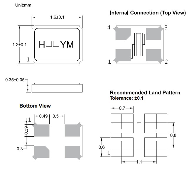 H.ELE加高無源晶振,X1CO37400BG1H-HZ,HSX111SA超小型晶振,1612貼片晶振,6G無線模塊晶振,尺寸圖