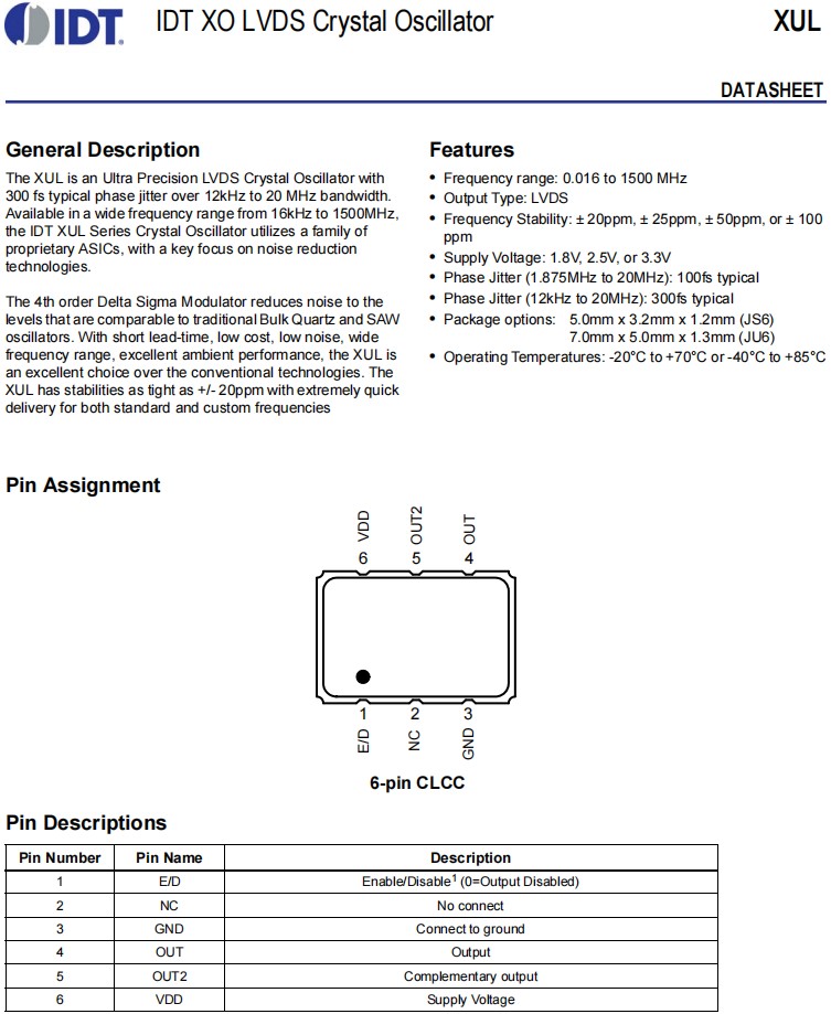 | XUL536100.000JS6I | IDT晶振 | OSC XO 100.0000MHZ LVDS SMD | XUL | 100MHz | LVDS |