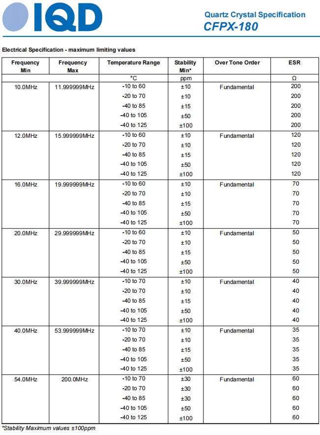 | LFXTAL083387RL3K | IQD晶振 | CFPX-180 | CRYSTAL 10.0000MHZ 12PF SMD | 10 MHz |