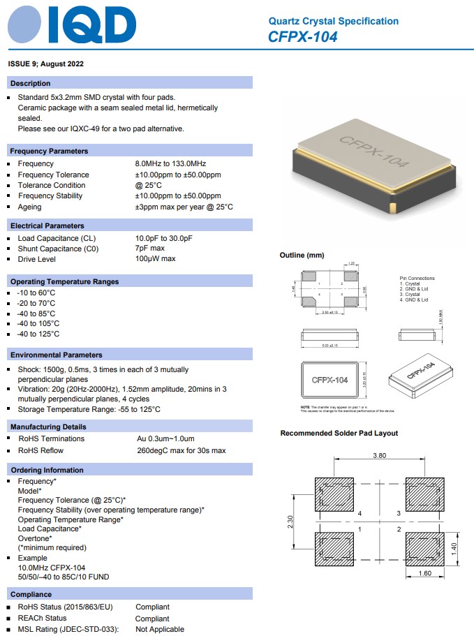 CFPX-104石英晶振,LFXTAL059529REEL,IQD進口晶振,6G車載晶振,LFXTAL032878REEL,5032mm貼片晶振