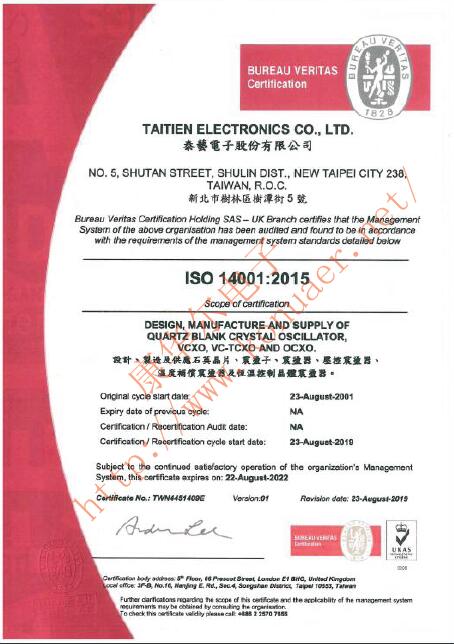 - [2020-07-10]臺系TST晶振公司ISO:14001:2015...