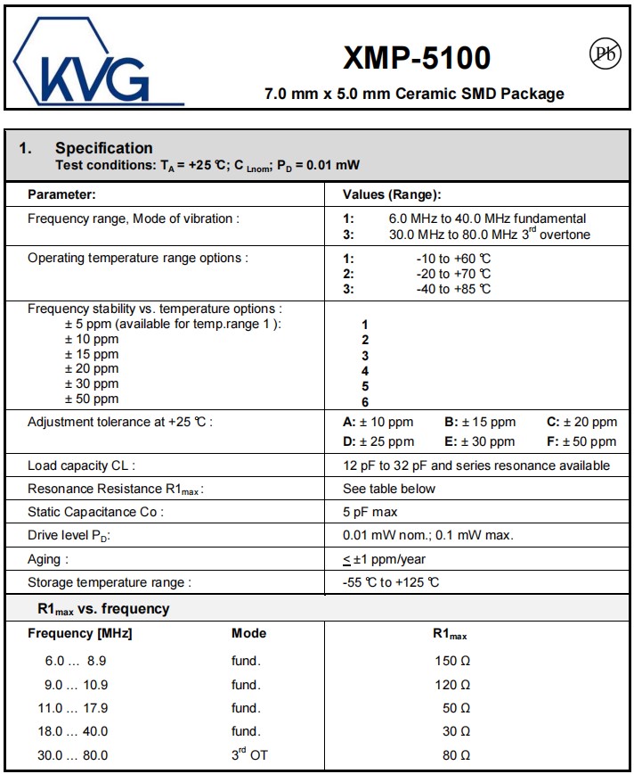 | Resonance Resistance R1max : | See table below | |||||||||||||||||||||||
