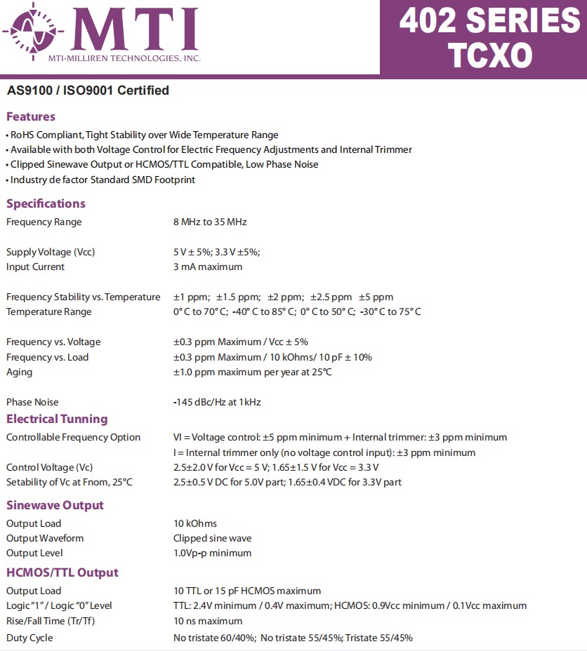 MTI-milliren溫補晶體振蕩器,402系列有源晶振,低抖動晶振,SMD晶振,無線網絡晶振,參數表