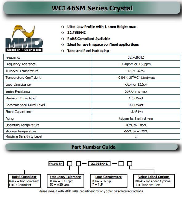 麥迪康7015mm晶振,WC146SMF50-32.768KHz-T,儀器儀表設備6G晶振,石英貼片晶振,石英晶體諧振器,參數(shù)表