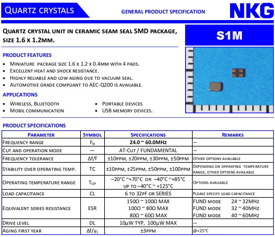 香港NKG無源晶振,S1M26.0000F18M23-EXT,USB內存設備6G晶振,香港NKG晶振,型號S1M系列,編碼為:S1M26.0000F18M23-EXT,頻率為:26MHz,小體積晶振尺寸1.6x1.2x0.4mm,四腳貼片晶振,石英晶體諧振器,無源晶振,無鉛環保晶振,具有超小型,輕薄型,優異的耐熱性和抗沖擊性。由于真空密封,可靠性高,老化率低。汽車級產品符合AEC-Q200標準。S1M系列無源晶振應用于:無線,藍牙,Mobil通信,小型便攜式設備,USB內存設備,智能手機,平板電腦,可穿戴設備等應用。