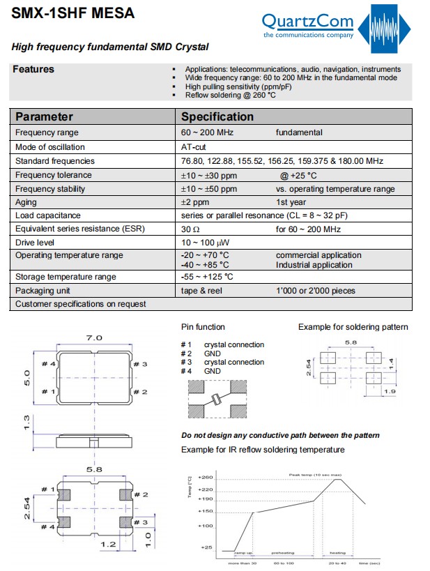 SMX-1SHF,石英通7050mm貼片晶振,儀器設(shè)備應(yīng)用晶振,瑞士進(jìn)口晶振,QuartzCom晶振,石英通晶振,型號:SMX-1SHF,是一款小體積晶振,尺寸:7.0x5.0mm封裝,四腳貼片晶振,無源晶振,石英晶體諧振器,7050晶振,石英晶振,高頻基線SMD晶體,無鉛環(huán)保晶振,寬頻率范圍:基本模式下為60MHz~200MHz,高牽拉靈敏度(ppm/pF),回流焊@260°C,工作溫度范圍:-20℃至+70℃商業(yè)應(yīng)用,-40℃至+85℃工業(yè)應(yīng)用。貼片晶振,應(yīng)用于:電信晶振,音頻晶振,導(dǎo)航晶振,儀器設(shè)備晶振,藍(lán)牙晶振,數(shù)碼電子應(yīng)晶振等。