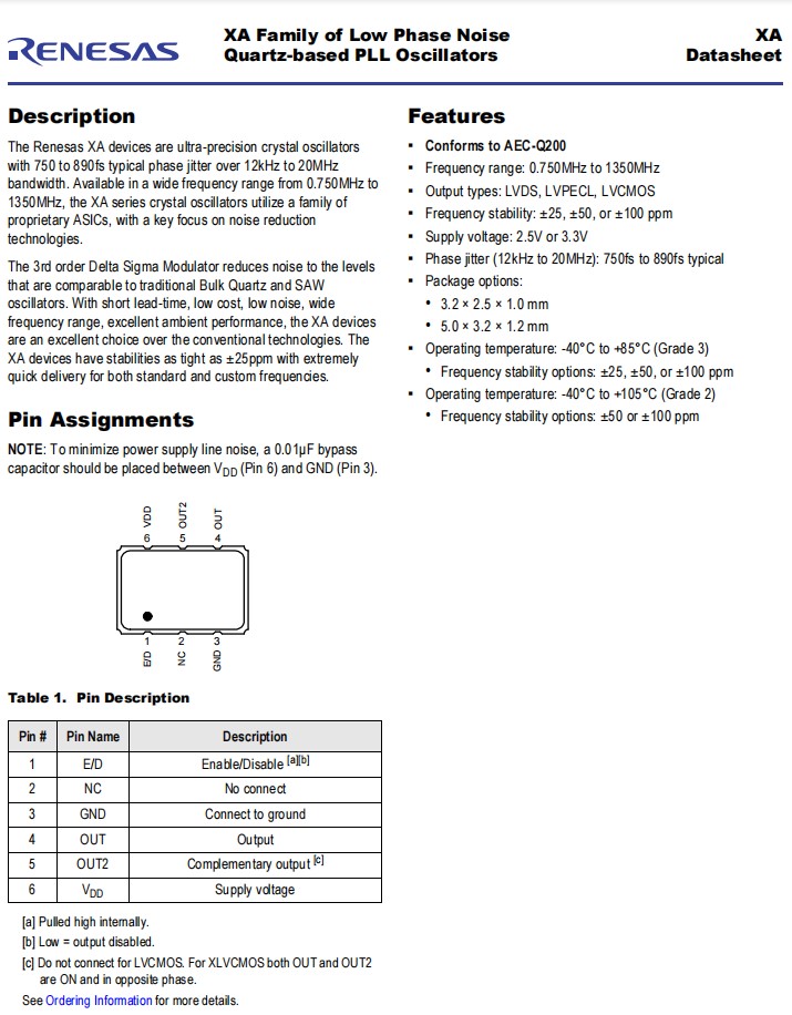 Renesas XA器件是超精密晶體振蕩器,具有750到890fs的典型的超過12 kHz到20MHz帶寬的相位抖動。XA系列有源晶振從0.750MHz到1350MHz到1350MHz,利用了一系列專有的asic,重點關注降噪技術。三階西格瑪調制器將噪聲降低到可與傳統的散裝石英和鋸紋波振蕩器相媲美的水平。XA系列具有較短的前置時間、低成本、低噪聲、頻率范圍廣、優異的環境性能,是超越傳統技術的優秀選擇。XA設備的穩定性高達±25ppm,標準和自定義頻率都非常快。