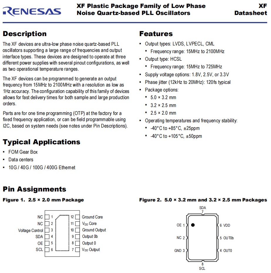 | XFC215800.000000K | Renesas瑞薩晶振 | DFN 2.00X2.50X1.00 MM, 0.40MM PI | XFC | 800 MHz | CML | 1.8V |