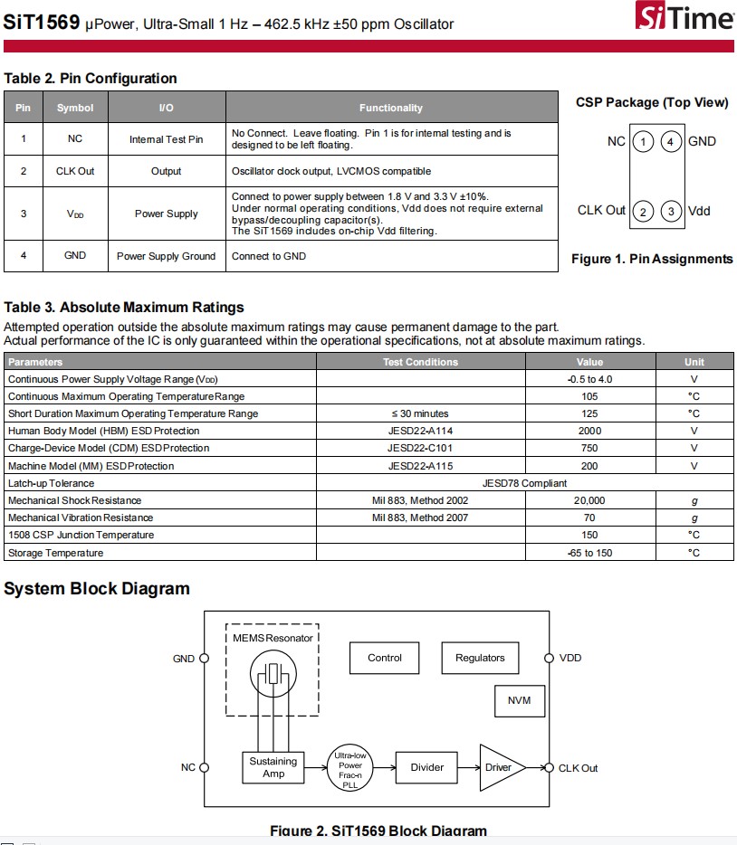 SiTime超小型晶振,SiT1569AI-J3-33E-0462.500000,便攜式醫療6G晶振,LVCMOS振蕩器,低電壓晶振,美國進口晶振,SiTime晶振,型號:SiT1569,編碼為:SiT1569AI-J3-33E-0462.500000,頻率為:462.5KHz,超小型晶振尺寸:1.5x0.8mm,SMD晶振,四腳貼片晶振,石英晶振,有源晶振,石英晶體振蕩器。超小1Hz-462.5kHz ±50ppm振蕩器,µPower工作電流:3.3µA(100kHz),工廠可編程頻率從1Hz到462.5kHz[1],±50ppmm最大全包頻率穩定性,世界最小的占地面積:1.2 mm2,1.5毫米x 0.8毫米CSP,0.6mm最大高度,外部旁路電容器需要,寬供電電壓范圍:1.8V到3.3V,LVCMOS兼容輸出,pb,RoHS和達到兼容。應用:智能手寫筆,可穿戴生物特征傳感,無線充電器,便攜式醫療。