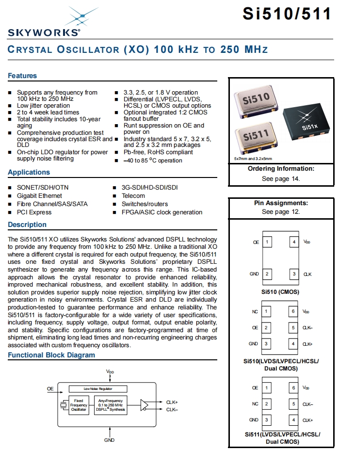 SkyworksOscillator,510FBA200M000AAG,Si510電信應(yīng)用晶振