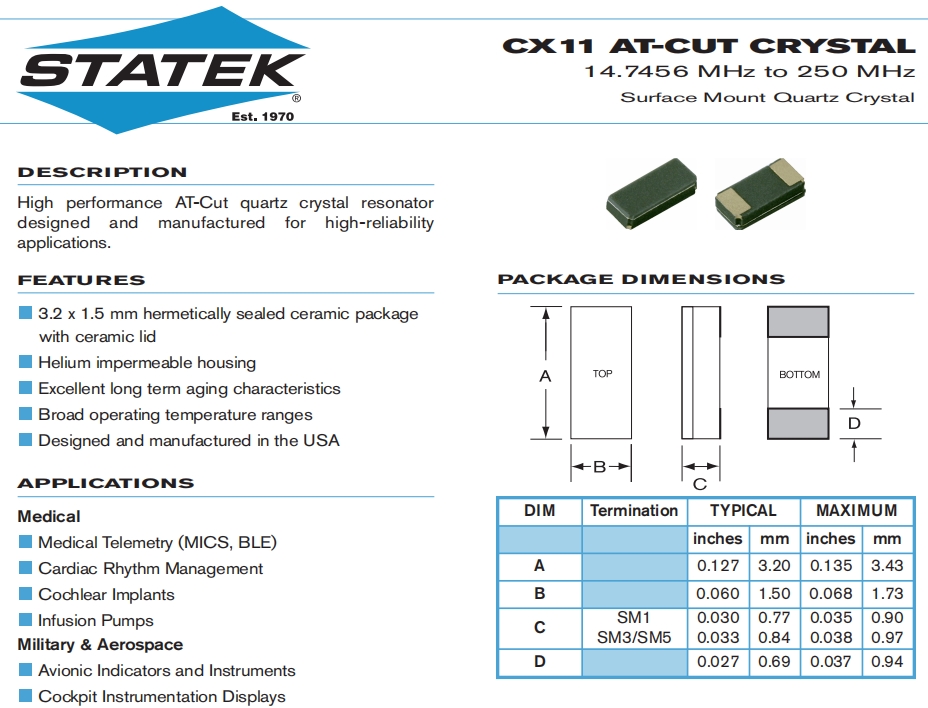 SMD晶振產品適用于范圍廣泛,適合用于心律管理,人工耳蝸,輸液泵,軍事與航空航天,航空電子指示器和儀器,駕駛艙儀表顯示器,數據通信,遙測,工業、計算機和通信,通訊,變送器,脈沖發生器,跟蹤信標,野生動物遙測等領域.CX11SCSM1-26.0M,50/50/-/I,9pF,Statek貼片晶體,6G儀器設備晶振.