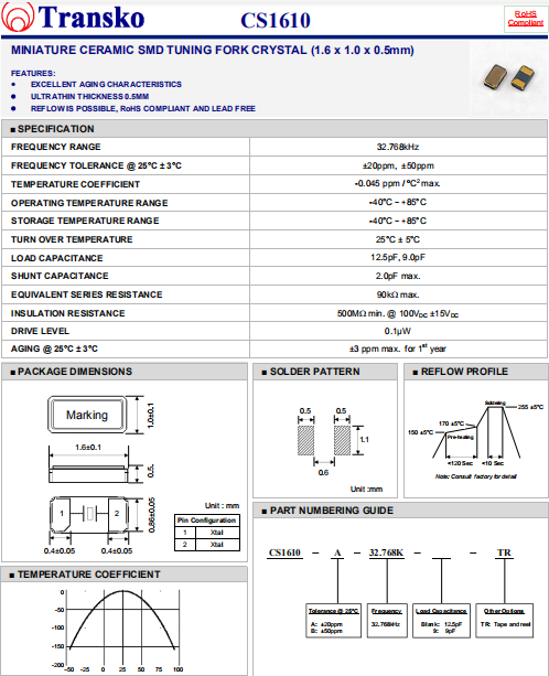 Transko晶振,CS1610晶振,進口音叉石英晶體,超小型,薄型,質地輕的表面貼片音叉型石英晶體諧振器,手機晶體,產品體積小,特別適用于各種小巧的便攜式消費電子數碼產品,在移動通信領域得到了廣泛的應用,晶振產品本身可發揮優良的電氣特性,滿足無鉛焊接的高溫回流溫度曲線要求.