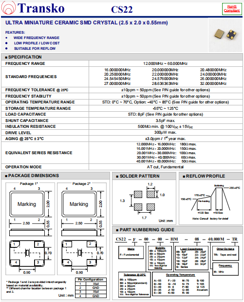 Transko晶振,CS22晶振,進口貼片晶振,小型貼片石英晶振,外觀尺寸具有薄型表面貼片型石英晶體諧振器,特別適用于有小型化要求的市場領域,比如智能手機,無線藍牙,平板電腦等電子數碼產品.晶振本身超小型,薄型,重量輕,晶體具有優良的耐環境特性,如耐熱性,耐沖擊性,在辦公自動化,家電相關電器領域及Bluetooth,Wireless LAN等短距離無線通信領域可發揮優良的電氣特性,滿足無鉛焊接的回流溫度曲線要求.