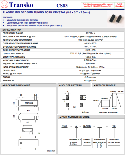 Transko晶振,CS83晶振,進口SMD晶體,32.768K時鐘晶體具有小型,薄型,輕型的貼片晶振表面音叉型晶體諧振器,產品具有優良的耐熱性,耐環境特性,可發揮晶振優良的電氣特性,符合RoHS規定,滿足無鉛焊接的高溫回流溫度曲線要求,金屬外殼的封裝使得產品在封裝時能發揮比陶瓷諧振器外殼更好的耐沖擊性.