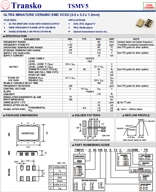 Transko晶振,TSMV5晶振,壓控晶振.小型SMD有源晶振,從最初超大體積到現在的7050mm,6035mm,5032mm,3225mm,2520mm體積,有著翻天覆地的改變,體積的變小也使產品帶來了更高的穩定性能,接縫密封石英晶體振蕩器,精度高,覆蓋頻率范圍寬的特點,SMD高速自動安裝和高溫回流焊設計,Optionable待機輸出三態輸出功能,電源電壓范圍:1.8V~5 V,高穩定性,低抖動,低功耗,主要應用領域:無線通訊,高端智能手機,平板筆記本WLAN,藍牙,數碼相機,DSL和其他IT產品的晶振應用,三態功能,PC和LCDM等高端數碼領域,符合RoHS/無鉛.