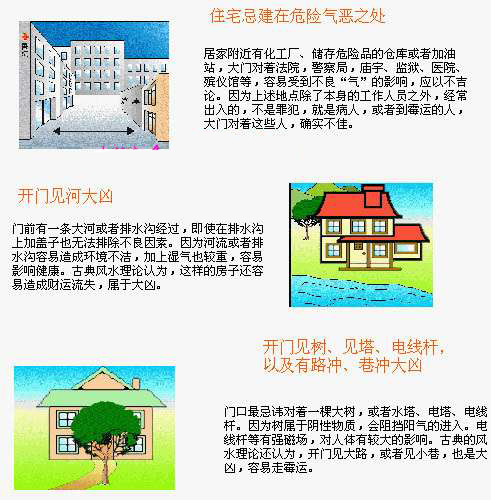 忌天斬煞。所謂“天斬煞”是指兩幢高樓大廈之間的一條狹窄空隙;因為好像用刀從半空斬成兩半,故此稱為天斬煞。倘若房屋面對“天斬煞”,很可能會有血光之災:空隙愈狹長便愈兇,距離愈近便愈險!故此宜選擇面對天斬煞的房屋居住,但若是在其背后有另一建筑物填補空隙則不妨。忌箭煞。“箭煞”是指住宅門外見尖銳的墻角沖射,尖引破財的原因,多與不列問題有關:因為身體健康總問題而破財;被他人欺騙而破財。化煞的方法要從。“天地人”著手,在門檻藏五帝錢,這是地化煞法;在門楣掛一個凸鏡,這是天化煞法;在廳拉環位置掛一用口含拉環的獸頭牌,這是人化煞法。