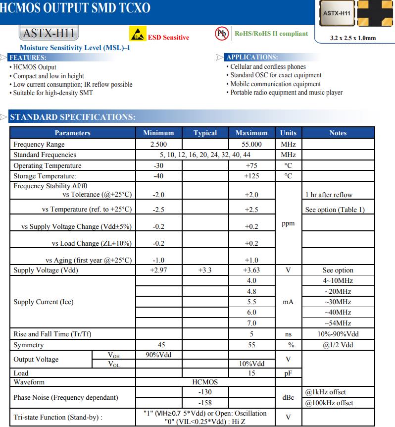 The ASGTX5 temperature-compensated crystal oscillator (TCXO) solution meets this stringent requirement at any carrier frequency between 15.0MHz and 2.1GHz. However, to achieve that precision,this solution has slightly worse RMS jitter than its third overtone ClearClockTM counterparts. For instance, it exhibits < 350fs typical RMS jitter at 156.25MHz carrier.